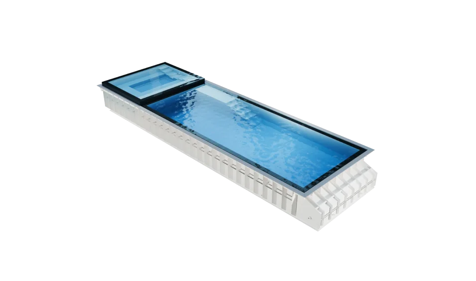 Dieser Infinity-Pool hat eine Konstruktion, bei der der speziell angefertigte Pool 2 Infinity-Seiten, 1 Überlaufseite und 1 normale (Standard-)Wandseite bietet. Die Höhe des Infinity-Teils ist spektakulär hoch: 90 cm.