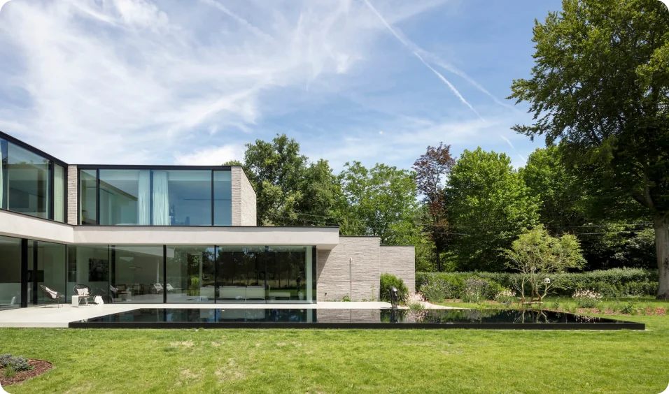 Die klaren Linien des Hauses, der Terrasse und des Pools passen perfekt zusammen. Die Eigentümer können jeden Tag die schöne Aussicht genießen. Selbst im Winter.- Maßgeschneiderter Swimmingpool mit einer Kombination aus Standard- und Infinity-Überlauf