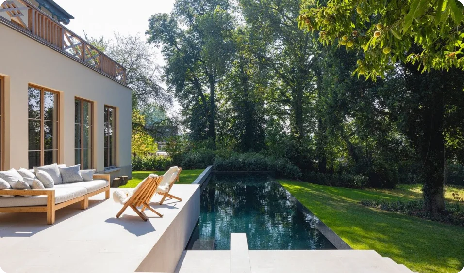 Spektakulärer 16 Meter Infinity-Pool mit ÜberlaufAlles an diesem wunderschönen Pool ist spektakulär. Die Kombination aus Unendlichkeit und Überlauf schafft ein wunderschönes Spiegelbild, das zum Gartendesign und den Höhenunterschieden passt. Die Größe ist ebenfalls beeindruckend: 16 Meter lang und 5 Meter breit. Wie gefällt Ihnen die Treppe entlang der gesamten langen Seite?