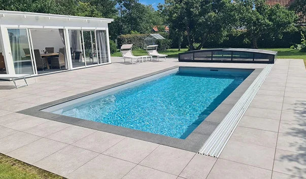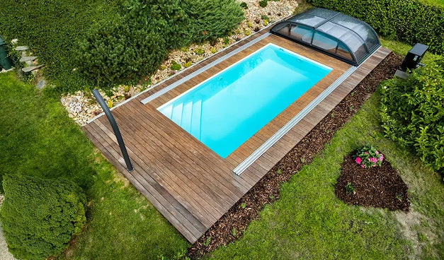 Eine weitere Sache, die man im Hinterkopf behalten sollte, ist, einige Meter Platz hinter dem Pool freizuhalten, falls man ein Pooldach haben möchte. Was viele nicht bedenken, ist, dass das Pooldach einen Platz braucht, wenn es den Pool nicht abdeckt. Man nennt diesen Platz oft den „Parkplatz“ des Pooldachs.