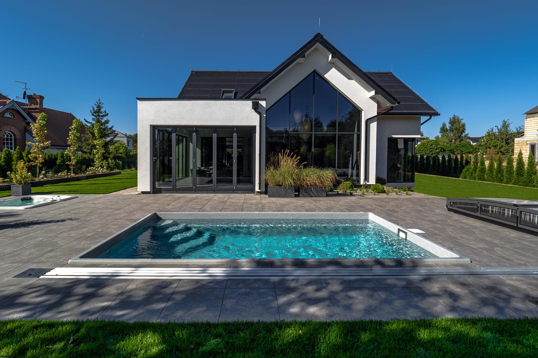 En af de mindre pools med målene 6m x 3m x 1,45 i forstærket polyester . Denne pool kan, ligesom alle andre pools, installeres indendørs såvel som udendørs i haver eller på terrasser. Modellen har en praktisk trappe på venstre side af poolens sidevæg.