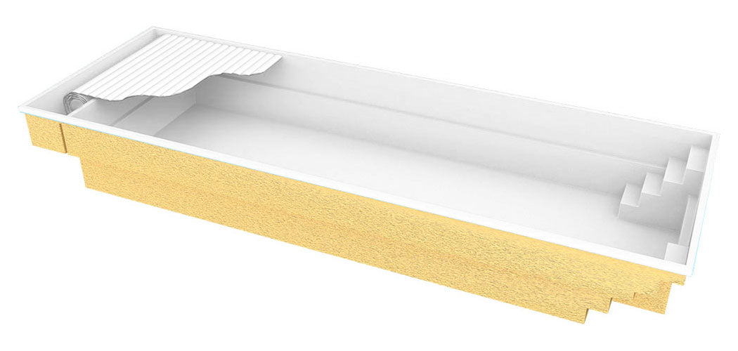 En af de større modeller. 11,10 x 3,75 m x 1,50 m. På grund af sin længde er poolen perfekt til professionel svømning og konkurrencer. Trapperne i denne model er designet, så de optager så lidt plads som muligt. Derudover har poolen et kammer til et poolovertræk. Poolovertrækket er den perfekte beskyttelse for børn og kæledyr.