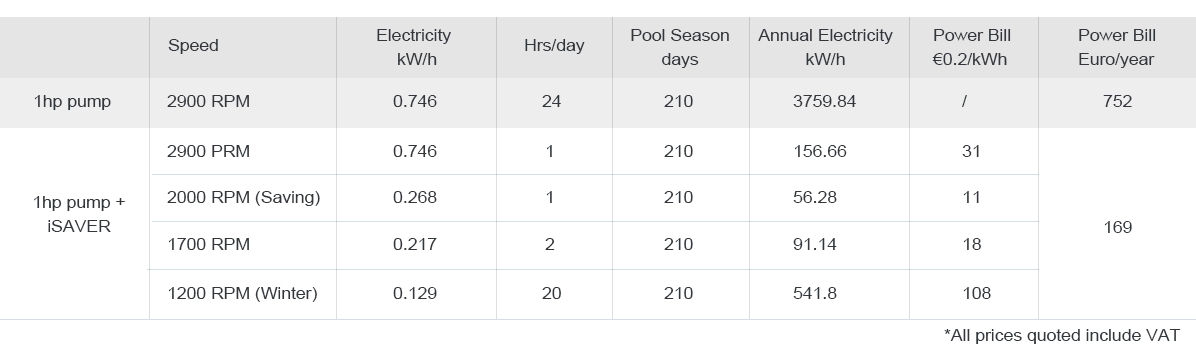 Nedenfor er en grov beregning af, hvor meget du kan spare om året med en iSAVER + poolpumpeinverter installeret.