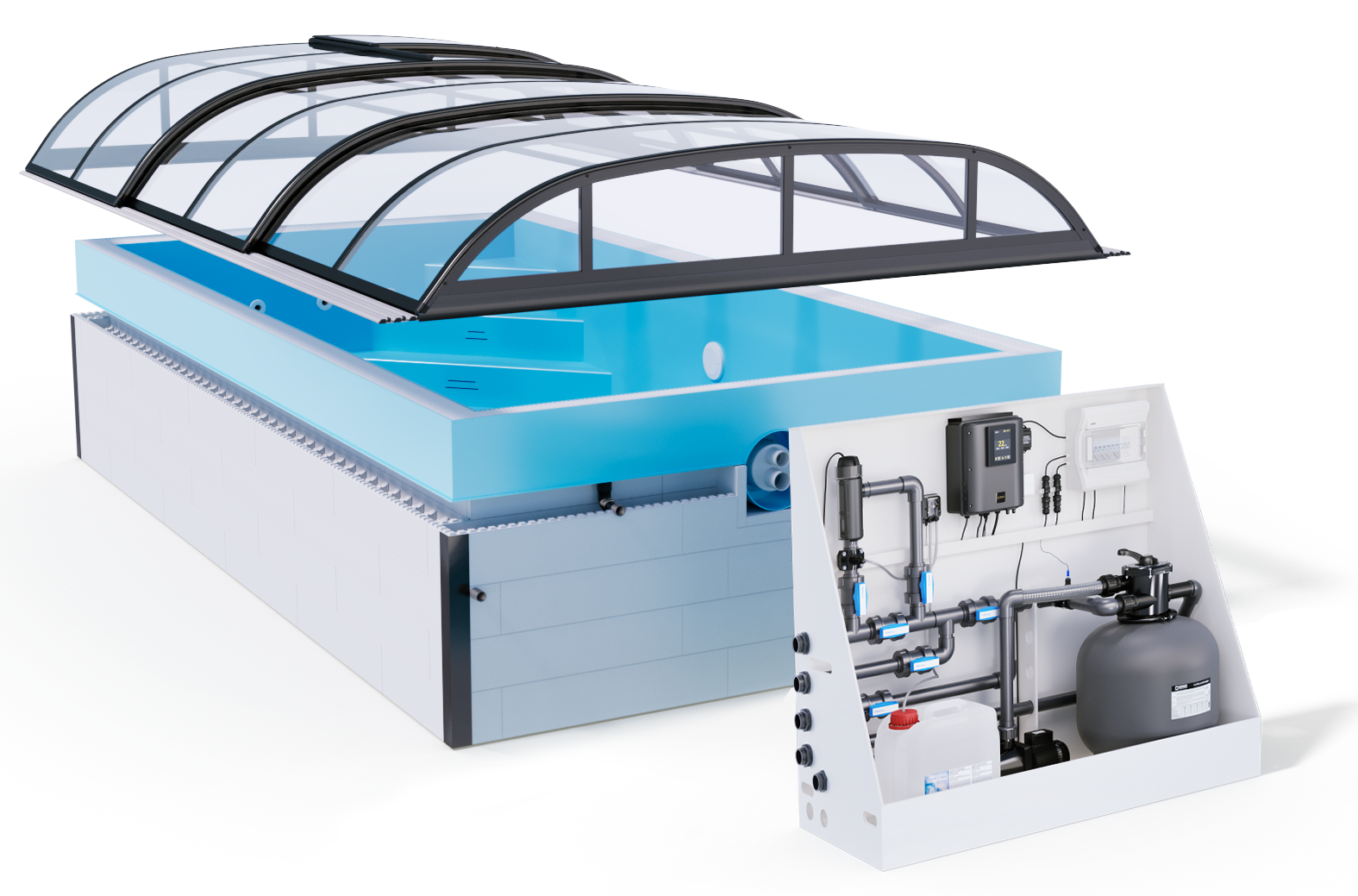 Minipool Wellness pool er en poolkonstruktion, der kombinerer fordelene ved termopoolkonstruktionen og PP Pools eksklusive materiale for at modstå høje vandtemperaturer uden at forkorte levetiden.