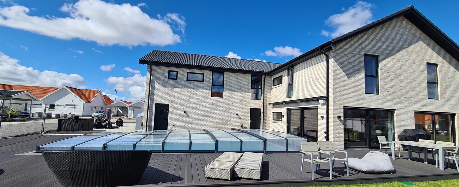 Et lavt pooltag med klart polycarbonatglas og antracit pulverlakerede aluminiumsprofiler.