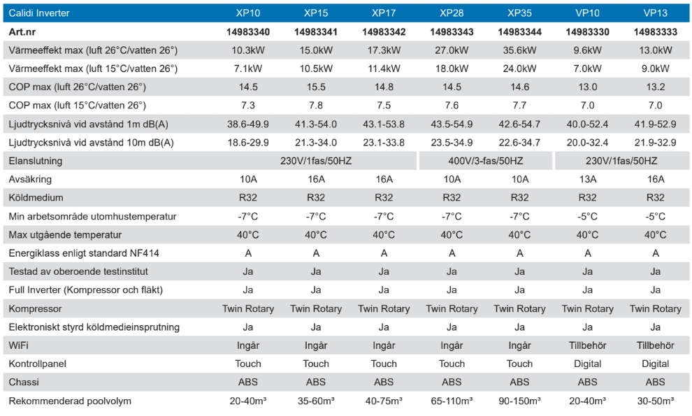 inverterstyrede poolvarmepumper Calidi XP & Calidi VP tilbyder banebrydende teknologi til effektiv og økonomisk opvarmning. Inverterteknologi tilpasser varmepumpens kapacitet til poolens behov , en teknologi der er bedre end en varmepumpe med en ON/OFF-funktion. Calidi er udstyret med en titaniumvarmeveksler og kan derfor også installeres i pools udstyret med en saltklorinator.
